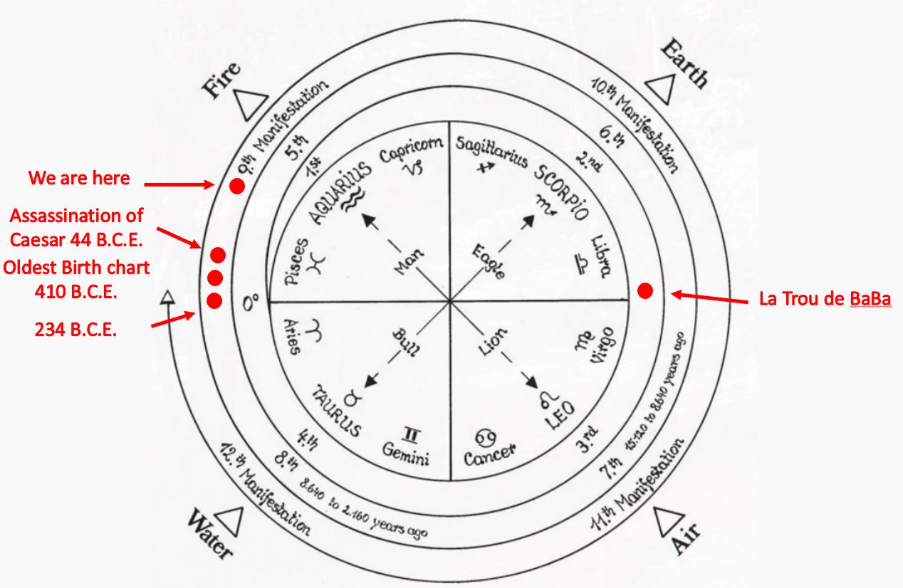 A brilliant Tarot Card reader, or psychic might demonstrate something close to this ability, but even then, it is mere intuition, it is not quite up to the level that Sri Aurobindo was discussing. His Supramental Yoga was precisely aimed at identifying Supermind, to be and become that Force of Being. In essence his goal was not so much to download an upgrade to the system but to install an entirely new system altogether. Although the aim of his work was intended to give birth to this ability, so that it would become widely accessible, until the completion of Aurobindo’s yoga the five senses as extensions of the sense-mind were not yet capable of receiving Direct Knowledge.7 The sensate world essentially runs things still because the Supramental is in its infancy. This point is essential to understand as we move forward in the analysis and review what the ancients could have possibly known regarding occult science. Below, we’ll point out extraordinary feats accomplished by Paleolithic Shamans, marvels in evolutionary terms when we consider that humanity occupied the 2nd manifestation for the first time, 47,520 to 41,040 years ago, when the Mental Being was only beginning to germinate. The “sense-mind’s” attunement with nature was growing in leaps and bounds, perhaps “feeling” at-onement with the Earth, and the physical sheath of the body, fully alive. Evolution had just traversed the mental quarter, the 2nd manifestation of The Great Circle, on its journey through the Signs by precession. Many astrologers are aware that there are 2,160 years in an age, but few think of how the ages themselves map. Traversing 3 Signs, one Quarter of the Circle, requires 6,480 years. This is called 1 Manifestation. There are 4 Manifestations in a complete round of the Zodiac, or 25,920 years. One Great Circle is comprised of 3 Rounds, or 36 Signs over a period of 77,760 years. So, with this framework we see that Humanity was preparing to enter the second quarter of the circle, the 3rd manifestation by precession, just over 40,000 years ago. The 2nd quarter of the Circle governs emotions, the Vital quarter which corresponds with the Vital Sheath of the body, opposite to where we are now. Presently, we are in the 9th manifestation, a time “when the child is born,” the 9th cosmic month so to speak. We are in a transition or critical point akin to what Pierre Teilhard de Chardin wrote about, a leap analogous to the discovery of clothing and shelter, or fire.