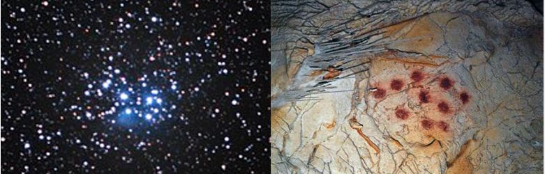 There is another exhibit that displays 10 red dots… rotating the picture sideways shows an uncanny resemblance to Pleiades. But such an interpretation makes me guilty of Pareidolia, a tendency to place cognitive significance to an image when the correspondence may be random, or incidental. The rational is simple enough. We have to appreciate that the Shamans of Prehistory used the sky to navigate like generations of descendants who came after them. Heading “down” into the cave, they would want to mark which way was “up” in order to get back out of the cave. Directionally, the shamans would move toward the “underworld” by heading in the direction of the base stars and move back to the Earth plane by reversing direction and following the stars at the top of the cluster. Although I am aware of this psychological response to phenomena and the tendency to give significance to an image that might not be real, I am also willing to give the shaman the benefit of the doubt. He would have seen the open cluster in the summer night sky, in what is today southern France. He then would have carried the replication of the star positions into the cave the next day, an approximation with only his memory serving as a model, much in the same way he reproduced the animal figures, not an exact replication but an extraordinarily close analog.