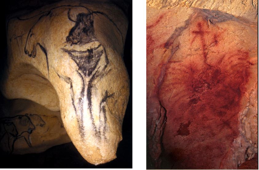 Imagine being one of the first humans in tens of thousands of years to lay eyes on the inner chambers of Chauvet. One interpretation holds that the cave was a place of transformation and power, a sort of Paleolithic church. Clottes hypothesized that the cave was a place of worship, where ancient people went to connect with the spirit world. He goes further and suggests that the ancient artists were perhaps not all that different from modern-day shamans and that they possibly attained altered states by means of reaching a hallucinogenic trance. In such a state they would open up a channel of creativity, connecting with soul consciousness, and begin to paint. (Interesting that Anil Seth’s new book called Being You, refers to consciousness as a kind of controlled hallucination…) Clottes’ conjectural ruminations about the cave are brilliant. Analogous to the evolutionarily model of the Gnostic Circle, we SEE that creation was moving through the 3rd quadrant, and 2nd quadrant, at the time. Again, a period representing an early Mental and Vital formation, in the 2nd and 3rd manifestations 40,000 +/- years ago. Evolution was on the horizontal axis of the map, aligned with the Equinoxes, in preparation for fully submerging into the Vital. As previously discussed, the capacity to feel and sense would be optimally attuned to the environment, instincts would be piqued, for relating and for survival, i.e., for fulfilling the most personal and physical needs. Cottes describes a phallic pillar adorned with paint, where a woman’s legs and the head of a bison and bear morph, Echer like, evoking a representation of her vulva beneath the facsimile of a triangular (3) pubic bone. A human hand is superimposed on the body of the bison. All of this is incredibly titillating stuff when we consider the time expanse and the early recognition of humanity’s identification with animals, connected with our own nature. The birthing process from orgasm to conception, to labor and delivery, was and is an expression of nature’s fiercest power. We are ALL in the most literal sense a “force of nature.” The exhibit described here is known as the Sorcerer, it communicates awe and veneration for life. An echo perhaps of an earlier chamber called the Sacred Heart, which depicts the anachronistic image of a cross (4).