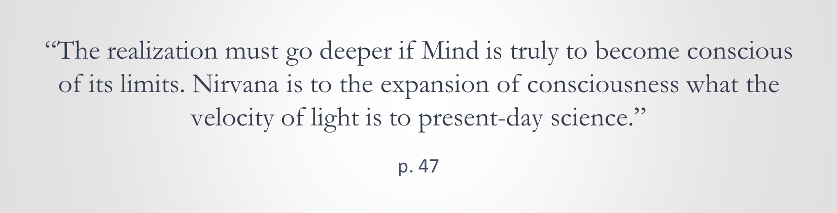 Sri Aurobindo pointed out in his supramental philosophy that the only thing faster than light is the “speed of consciousness.” But Nirvana, as a mental construct, can only be understood as being a small step along the way toward Truth. From this perspective, a deeper realization is needed, otherwise Jhana only serves to erase the realization by taking two steps back for every step forward. Nirvana then was construed as a revolutionary spiritual notion in the same way that the speed of light was conceived of by Einstein. The trouble is that both Nirvana and the speed of light remain within the regent of Mind, so there are limitations attached. Breaking the limitations of the Mind is what will create true liberation and enable the individual and collective to surpass the boundaries that open the way to the next frontier.
