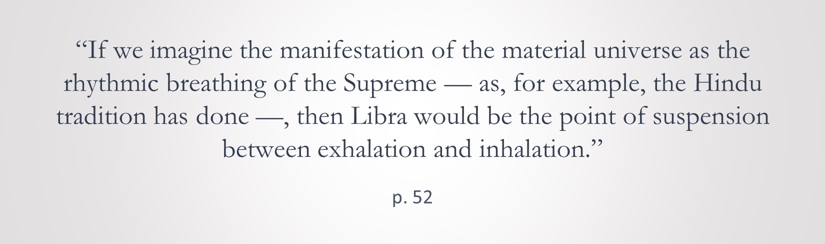 As mentioned, Libra is the point where the descending and ascending movements meet on the wheel, where two universal principles JOIN, and why Libra is the sign corresponding to YOGA. But the caveat mentioned in the commentaries reminds us to consider that “yogic discipline is a process, not the actual realization,” and so the point of balance brings us to a preliminary stage, a preparatory point of harmonization. In the story, arrival in the second Air sign is accompanied by encouragement to “strive for union.” However, the admonition made in the remarks warns that “union is not unity.” Still, awareness of the goal is planted in Libra, even though there is division remaining, and separation looming. A distinction is made at this point between Gemini and Libra, where pairing in the second Air sign reveals couples who are differentiated, “because Libra comes into evolutionary being after passage through the signs epitomizing the passive and active poles or feminine and masculine principle, — namely, Cancer and Leo.”