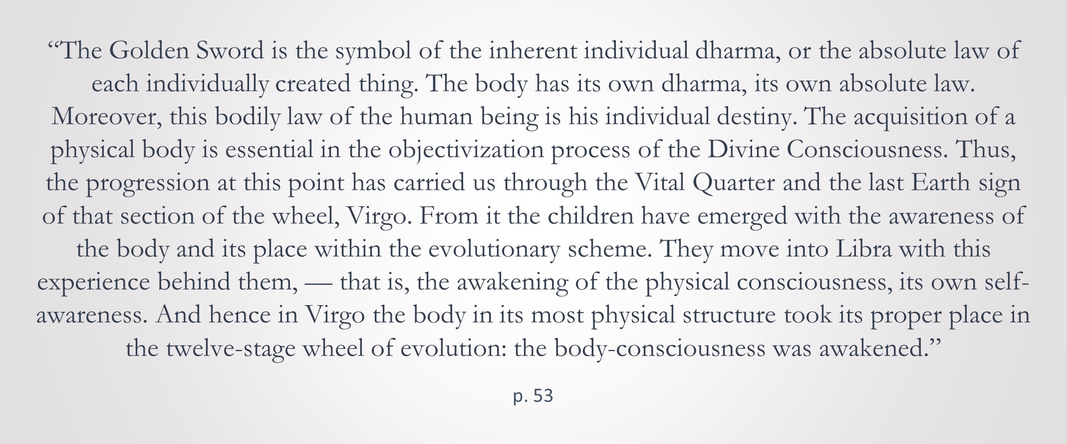 The key for properly comprehending the zodiacal wisdom in this regard divides the twelve-fold circle into four parts. The first quarter of the wheel corresponds with the Physical, initiated by Aries but associated with Earth. The next quarter aligns with the Emotional and is initiated by Cancer, whereas the third quarter corroborates the Mental and is initiated by Libra. In the first quarter, Gemini is the epitome of physical progress and therefore we find Mind in Matter. The second quarter epitomizes the Vital sheaths of the human body. The third quarter represents the Mental on its way to Supermind, exemplified by the sign Sagittarius when we reach that place on the wheel later in the story.