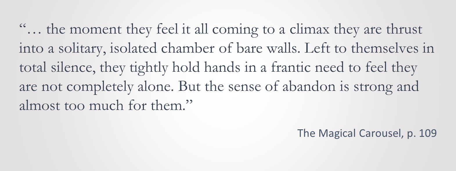 Each apparition appears then fades as if to signal that there is more to see than THIS and so the journey continues higher. The force carries them through the darkness until another vision “comes to light.” The next vision puts an enormous table on display with every imaginable food possible on it and the robed lady is seated gorging herself “grotesquely” grabbing whatever is within reach and stuffing herself, items disappearing into the hood that hides her face. The children tempted to join in on the feast, their appetites whetted and ravenous, but then this image too disappears “leaving them to continue their magical ascent in the darkness.”
