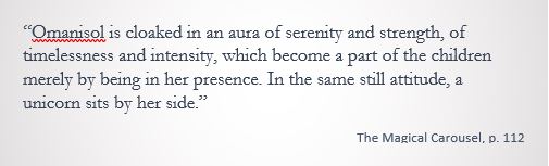 Omanisol wears flowing robes that blend with the earthy colors of the mountain, as if she is growing from the mountain itself. She is “immobile and breathing ever so slightly, in a manner which makes one feel the physical life in her is suspended. Her face is not old, but rather ancient, and her half-closed eyes reveal an understanding that is of the nature of the mountain over which she presides.”