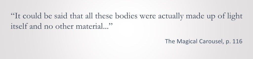 The speaker addresses his “friends” to come and learn about their mission, to discover how best to make use of their qualities in successfully completing the work. Since the goal that is stated is for the good of all mankind there is a heightened sense of significance attached. But more work is required. The speaker brings the children into a special chamber where etheric spirits guide them in the ways of higher perception and specific modes of communication. Finally, their sojourn in Aquarius is done.