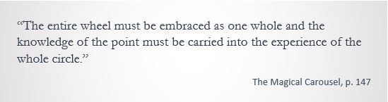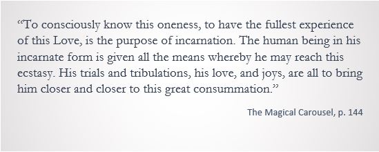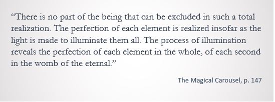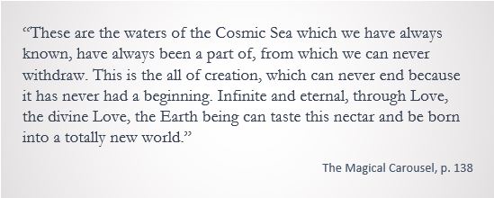 The entirety of the story of The Magical Carousel describes an initiation into a sacred mystery for the realization of joining a New Movement, “a joyous abandon into the movement of creation which was not felt before.” There is an all-knowing, all-seeing sense of things that penetrates the deepest recesses of existence, meaning an illuminating Knowledge that acts within and without the individual’s sense of being: “the message of Oneness, of Love.”