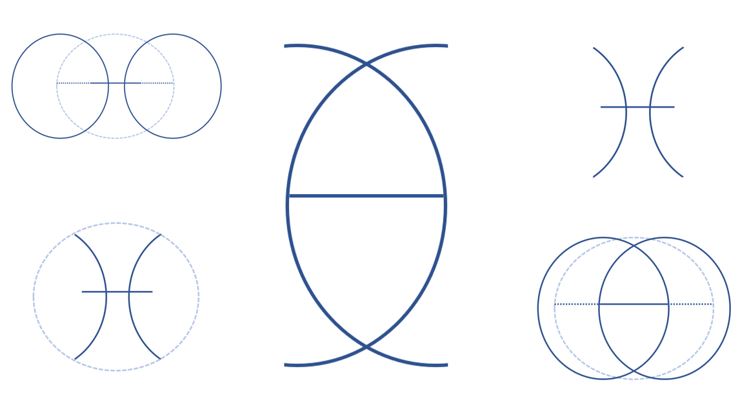 Lori Thompkins wrote about the Vesica Piscis in her 2018 book Geometric Keys of Vedic Wisdom and shares a remarkable story about how she discovered the ancient symbol of the three fishes and one head, the seed of a vision which was surely born in Patrizia Norelli-Bachelet’s work. Lori worked closely with Thea and relates her unique perspective of Thea’s esoteric understanding with fresh eyes. But before leaping ahead and too far afield of The Magical Carousel, let me bring the discussion back to where we left off and the point Thea made stating that “the real glyph is formed of two half circles, the center of one being the circumference of the other; the central line therefore serves to join the two radii/circumferences, in the following fashion.”