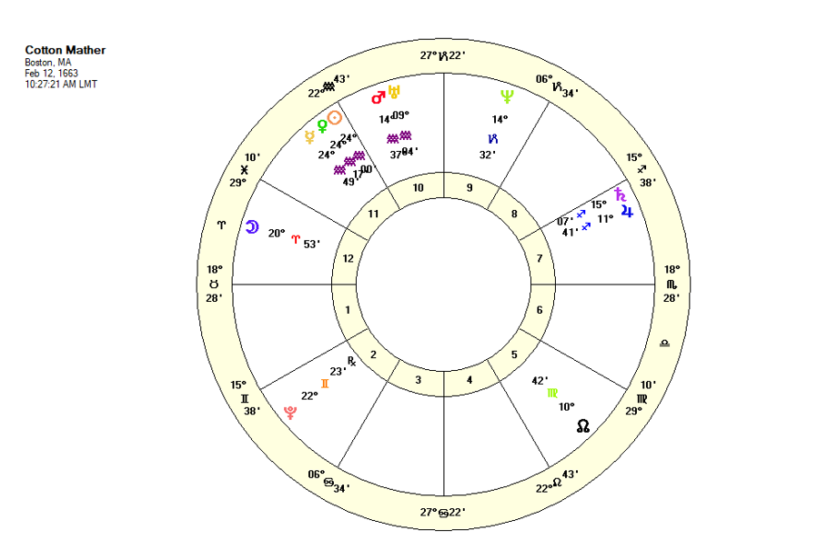 Cotton Mather’s prolific writing career and need for public approval suggest a deep-seated desire for recognition. Perhaps this stemmed from the relationship he had with his successful father. A relentless drive, while fueling his productivity, might have also contributed to a sense of self-importance. An extremely close line up between the Sun, and the inner personal planets (idealism) in the 11th house, and the Moon in the 12th house (introspection) combines the Sun in Aquarius with the Moon in Aries, always a Mary Poppin’s quality. We might call this combination the supercalifragilisticexpialidocious effect.