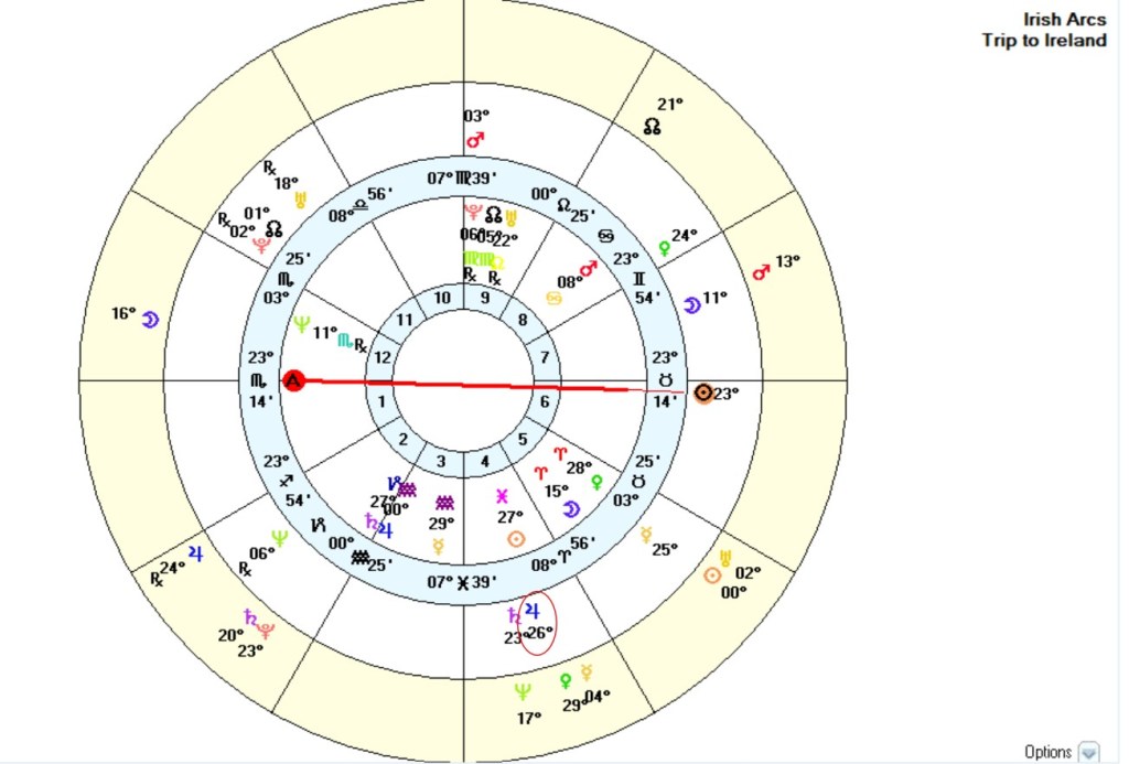 Briefly, my chart shows Solar Arc Sun exact on the horizon, the 7th house cusp. Solar Arc Jupiter has also arced to my natal Sun. The Sun rules my 9th house of distant, perhaps international travel.
