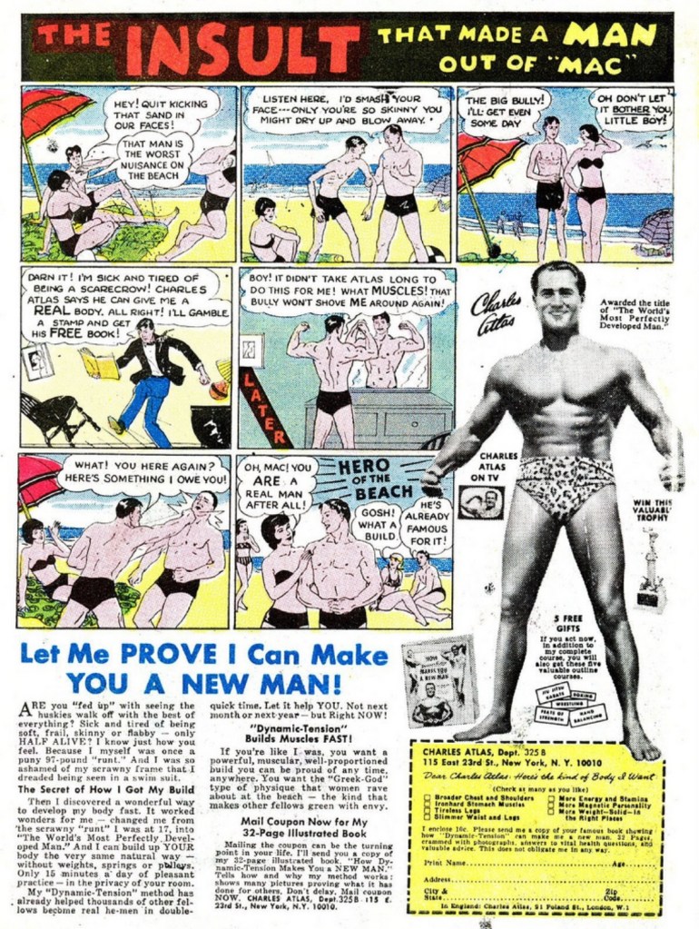 In the 1930s an iconic ad began to appear in the back of magazines. It was called The Insult that Made a Hero out of “Mac” and was the brain child of muscle man Charles Atlas who was selling his Dynamic Tension Course which was aimed at anyone who felt emasculated by the rough and tumble reality of the world. The ad was a comic strip that depicted a thin frail man (“Mac”) having sand kicked in his face by a muscular bully who threatened “Mac” and forced him to “shut up and put up.”