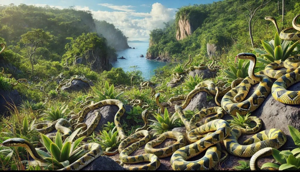 “Queimada Grande” means Large Burn — the island was named after the Brazilian Navy’s attempt to control the overwhelming snake population by burning the vegetation, yet the golden lancehead vipers thrived despite these efforts, leaving the island to its true inhabitants, the deadly snakes.
