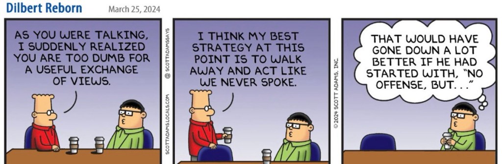 Adams’ rhetorical style is admirable in its effectiveness, in the sense that he has over one million followers of X for example, writes books and has a successful YouTube channel. He would argue, and Tucker Carlson might also, that the eyeballs are all that matter, but something about his takes smack me of being absurd and dangerous.