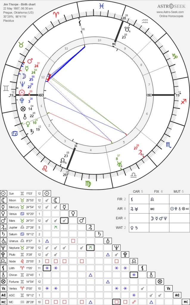 Saturn is peregrine, and ruling the 8th, from the 2nd. He might have easily died a multi-millionaire but the Saturnian force, which he summoned so admirably as an athlete, imposed to great of a restraint, limiting his income and the accumulation of assets. One of his personality flaws was that he was too generous with his money and on occasion simply gave it away wastefully.